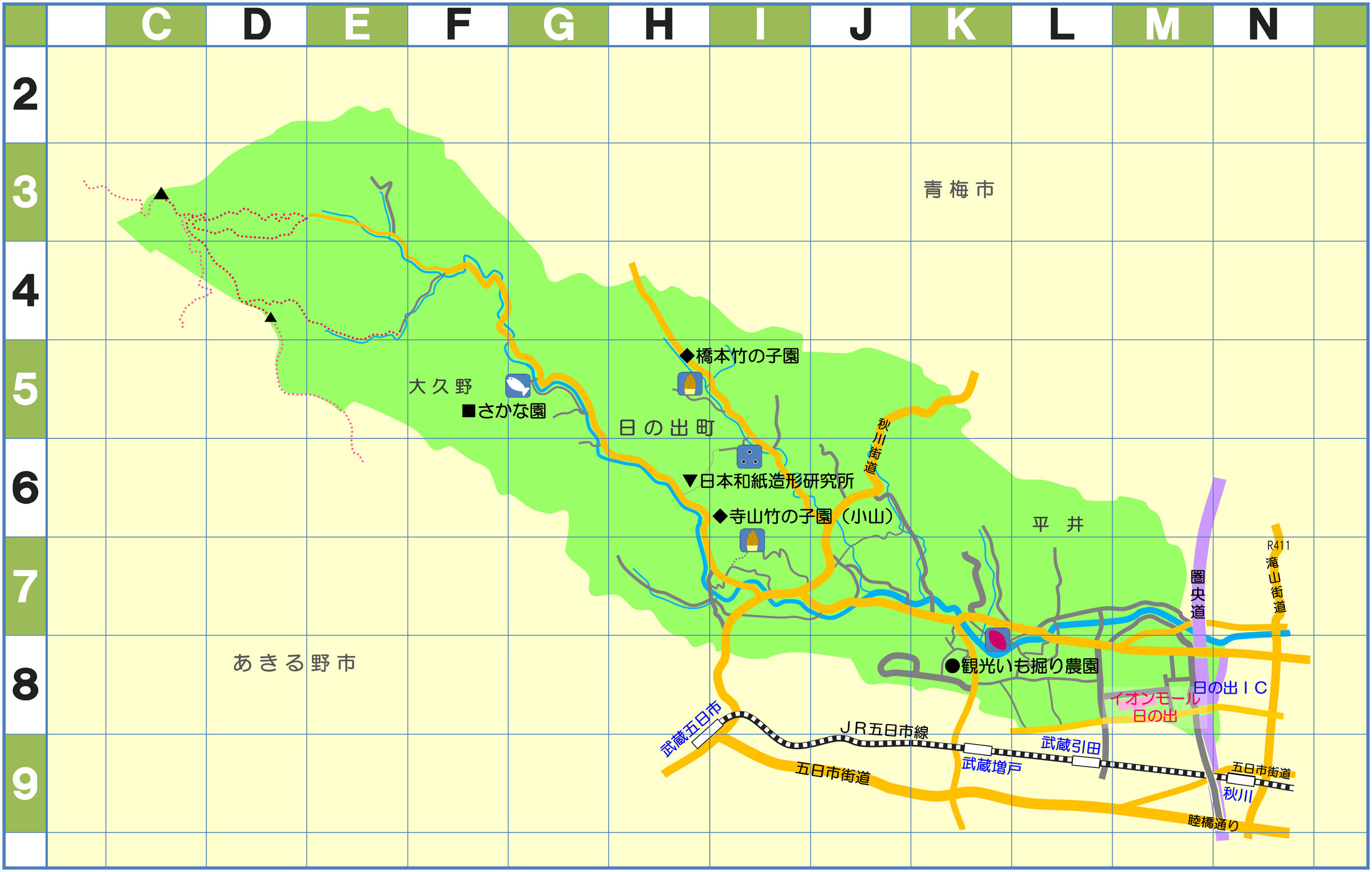 ※索引用のアルファベットと数字は、観光マップ「日の出WALK」に対応しています。
