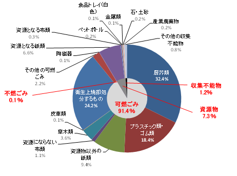 注3)赤文字は、大分類の可燃ごみ、不燃ごみ、資源物、収集不能物の組成割合を示しています。