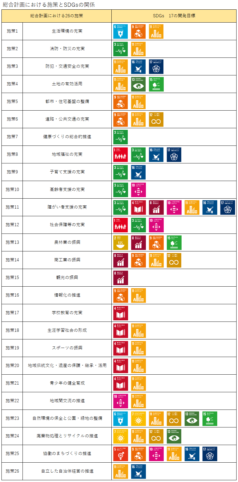 日の出町では行政運営の総合的な指針となる第5 次日の出町長期総合計画を掲げています。総合計画で掲げている施策は、 SDGs の理念と重なるものであり、基本計画「第 5 次日の出町長期総合計画」を推進することが SDGs の達成に向けた取組であると考えています。