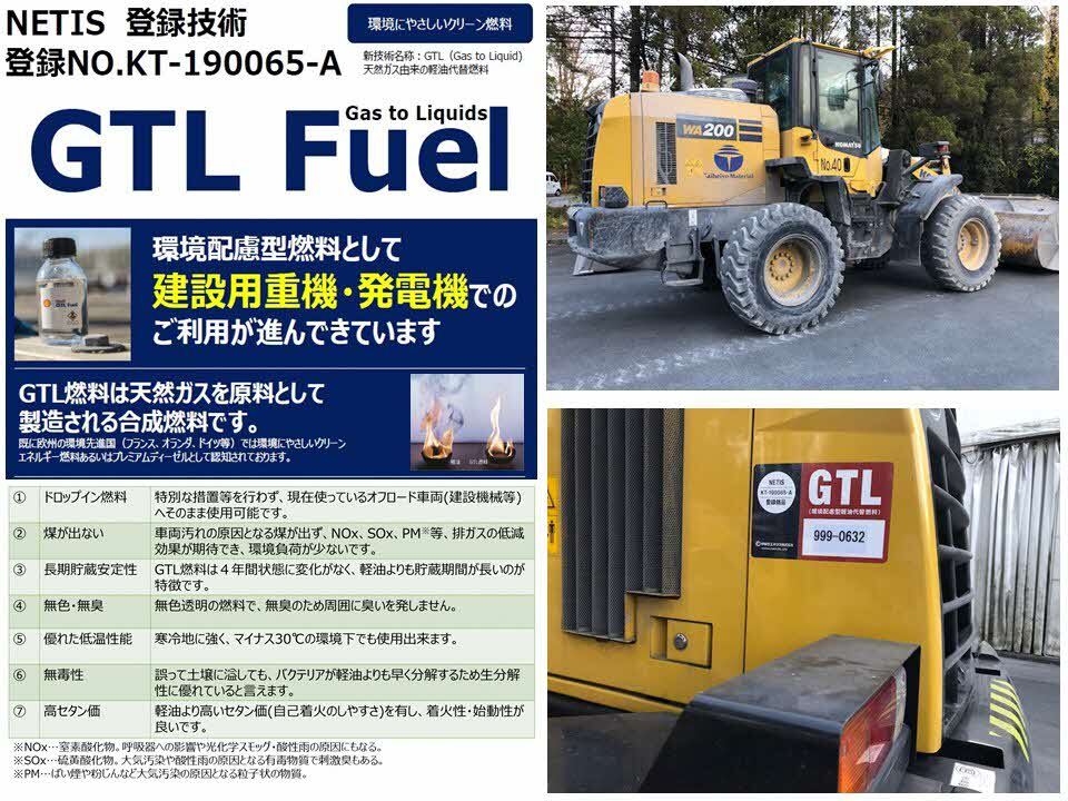 GTLは軽油代替燃料で重機の既存のディーゼルエンジンの仕様を変えずに使用することができます。