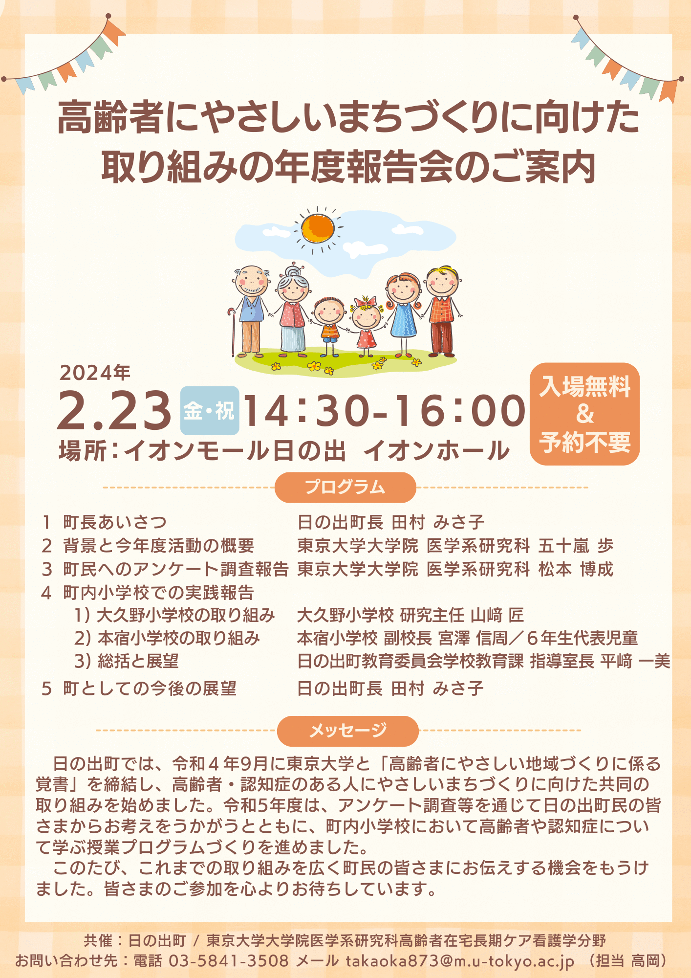 日の出町では、令和4年9月に東京大学と締結した「高齢者にやさしい地域づくりに係る覚書」に基づき、高齢者・認知症のある人にやさしいまちづくりに向けた取り組みを進めています。