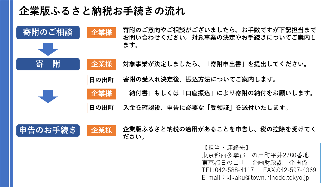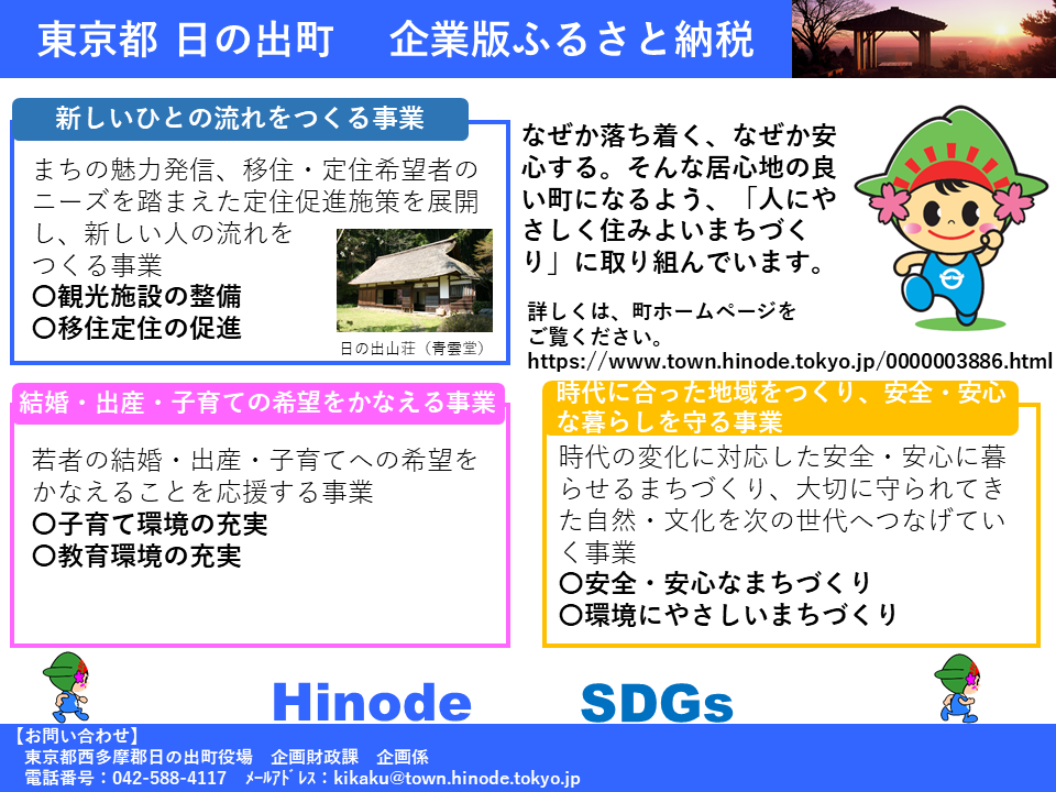 日の出町では、令和6年度より、企業が地方自治体の地方創生の取組に対して寄附をした場合に税額控除を受けることのできる、「企業版ふるさと納税(地方創生応援税制)」を開始しました。