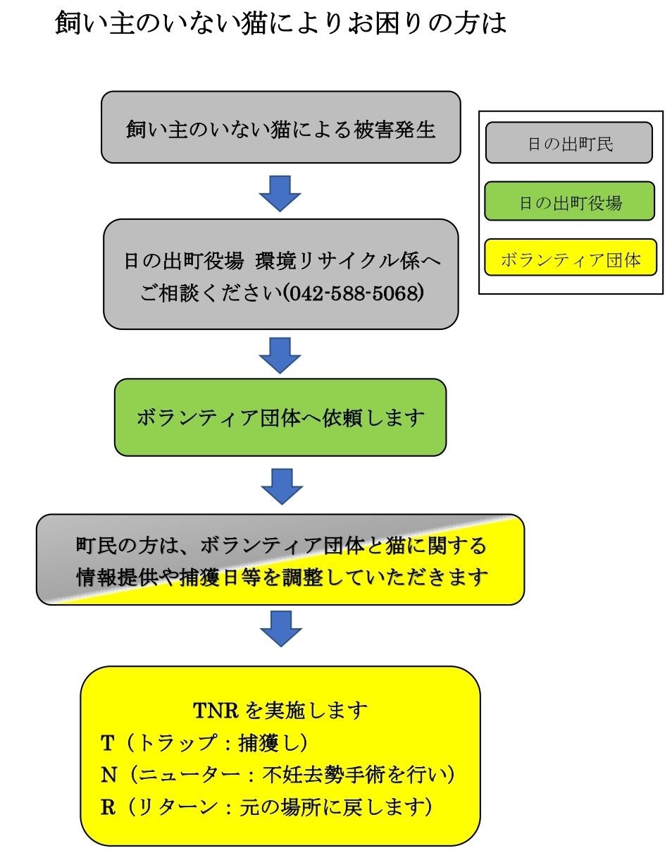 町では、飼い主のいない猫問題の解決方法として、「公益財団法人どうぶつ基金」が手術費等を全額負担する「さくらねこ無料不妊手術事業(行政枠)」に参加し、日の出町内に棲みつく飼い主のいない猫を減らす活動を行う、ボランティア団体などと連携してTNR事業を行います。
