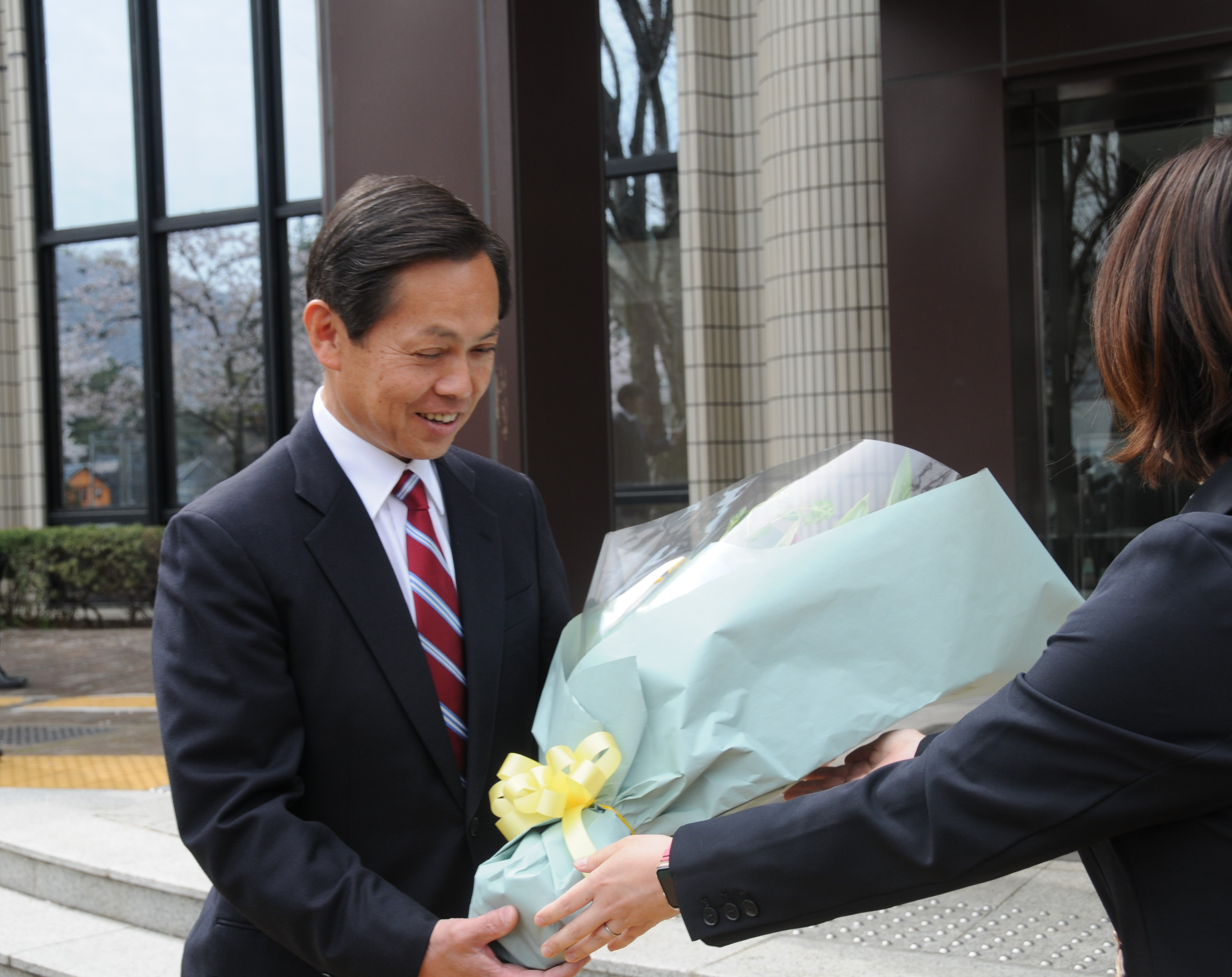 令和7年3月23日の選挙で当選した東町長が、4月11日の朝、初登庁しました。